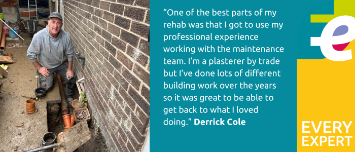 Derrick says: “One of the best parts of my rehab was that I got to use my professional experience working with the maintenance team. I’m a plasterer by trade but I’ve done lots of different building work over the years so it was great to be able to get back to what I loved doing. I asked my partner to bring some of my work clothes in, and I began helping with painting some walls and general maintenance. I think I worked a bit too quickly – it took me 5 hours to do something that was supposed to take a week! Val, the service manager at Adderley Green even offered me a job there when I was leaving!
