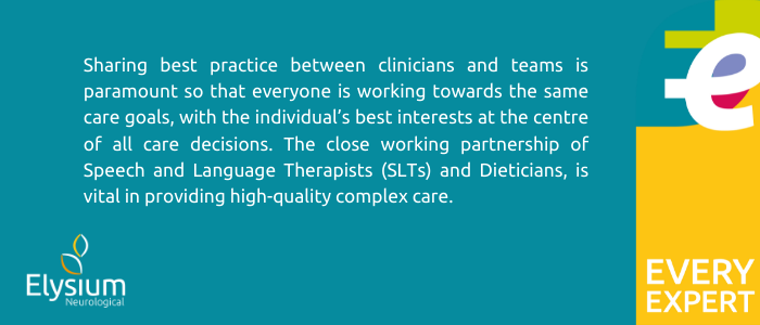 In particular, the close working partnership of Speech and Language Therapists (SLTs) and Dieticians, is vital in providing high-quality complex care. SLTs have specialised knowledge in communication and dysphagia, whilst dieticians can practise dysphagia assessment and management as well as offer clinical support for diet and nutrition related conditions.
