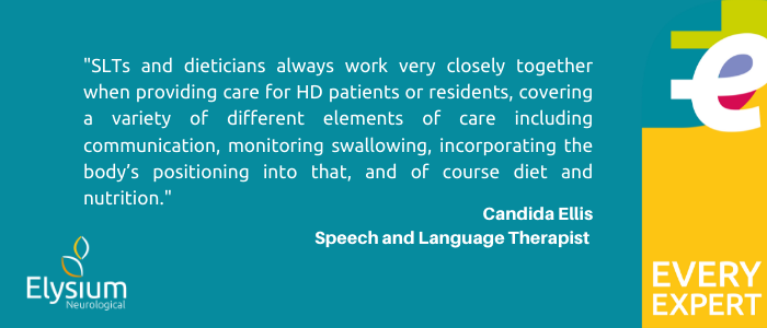 She says: “SLTs and dieticians always work very closely together when providing care for HD patients or residents, covering a variety of different elements of care including communication, monitoring swallowing, incorporating the body’s positioning into that, and of course diet and nutrition.