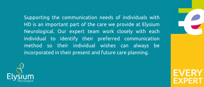 Supporting the communication needs of individuals with HD is an important part of the care we provide at Elysium Neurological. Our expert team work closely with each individual to identify their preferred communication method so their individual wishes can always be incorporated in their present and future care planning.