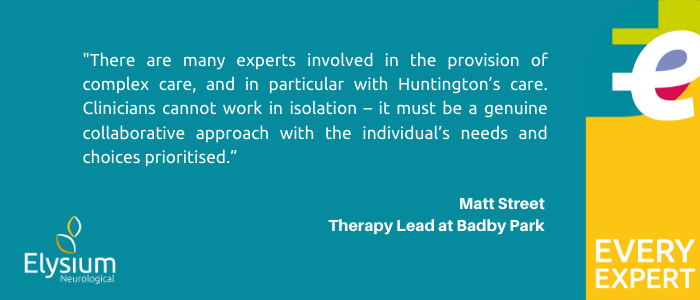 He says: “There are many experts involved in the provision of complex care, and in particular with Huntington’s care. Clinicians cannot work in isolation – it must be a genuine collaborative approach with the individual’s needs and choices prioritised.