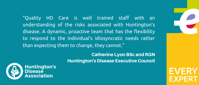 In this article we talk with Catherine Lyon BSc and RGN (Retired), and Member of the Huntington’s Disease Association Executive Council, about what good quality Huntington’s disease care looks like and why a dynamic, proactive team that has the flexibility to respond to the individual’s needs is essential.
