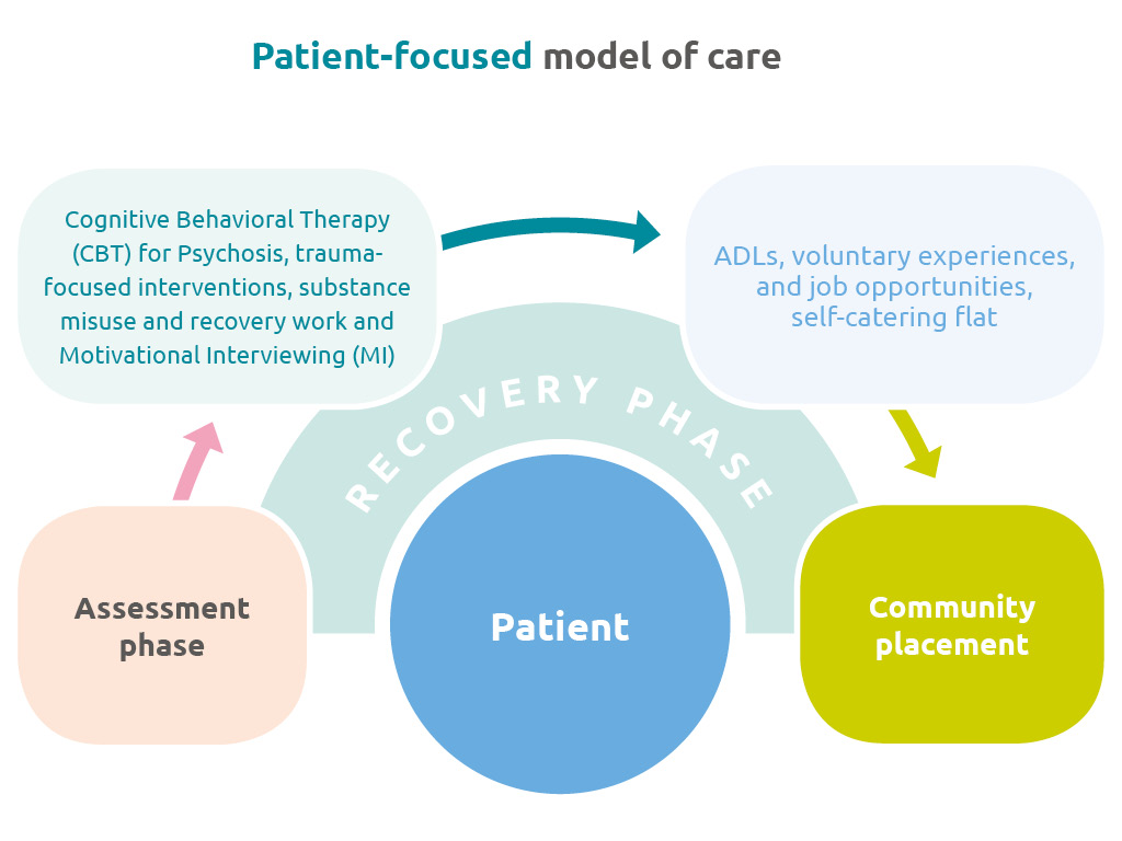 The MDT work collaboratively with patients to develop individualised treatment and care plans to meet their complex needs. Shared decision-making is supported to ensure the patient’s goals are at the centre of their treatment. The highly skilled team offer evidence-based approaches such as CBT for psychosis, trauma-focused interventions, substance misuse and recovery work and Motivational Interviewing (MI). Patients have access to a wealth of community projects, including peer support initiatives, recovery colleges, music programmes, art networks and volunteer work opportunities. This rich tapestry of community resources plays a vital role in the patient’s rehabilitation, fostering personal growth, social connections and practical skills essential for their ongoing recovery and reintegration into society.