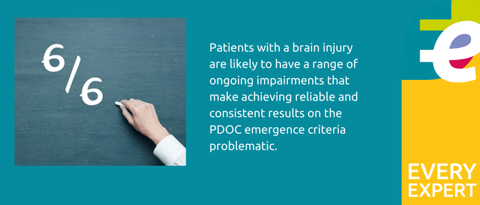 Patients with a brain injury are likely to have a range of ongoing impairments that make achieving reliable and consistent results within this criteria problematic. Therefore, the Guideline Development Group (GDG) proposed an extended set of parameters which also includes discriminatory choice making (successfully choosing between two objects). However, the ongoing impairments experienced by brain injury patients do not always present clearly, providing additional challenges to clinicians assessing them.