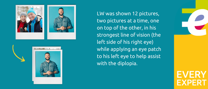 “So, I had to literally map out his visual field and where he could track – I drew it out section by section. Then when I could see it laid out in front of me, I had that light bulb moment, and after many weeks I knew what it was – hemianopia. LW lost the sight in the right-hand side of his right eye and the right-hand side of his left eye. We also know that because he’s got a deviated gaze, he has double vision as well. And he has an inattention to the left-hand side on top.”