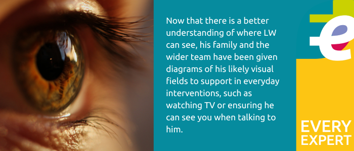 “Now that we have a better understanding of where LW can see, we have given diagrams of his likely visual fields to support family and our wider team in everyday interventions, such as watching TV or ensuring he can see you when you’re talking to him.