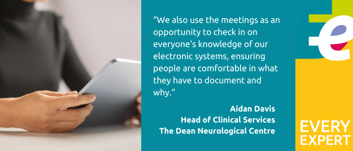 “We also use the meetings as an opportunity to check in on everyone’s knowledge of our electronic systems, ensuring people are comfortable in what they have to document and why. Our documentation training is now treated as mandatory and we’re making really good progress towards ensuring 90% of our staff as a minimum have had this training.”