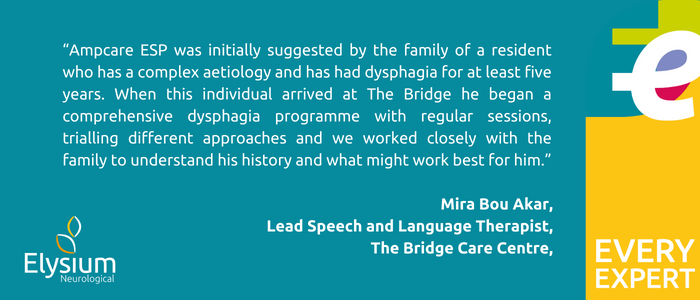 Mira explains: “Ampcare ESP was initially suggested by the family of one of our residents who has a complex aetiology and has had dysphagia for at least five years. When this individual arrived at The Bridge he began a comprehensive dysphagia programme with regular sessions, trialling different approaches and we worked closely with the family to understand his history and what might work best for him.