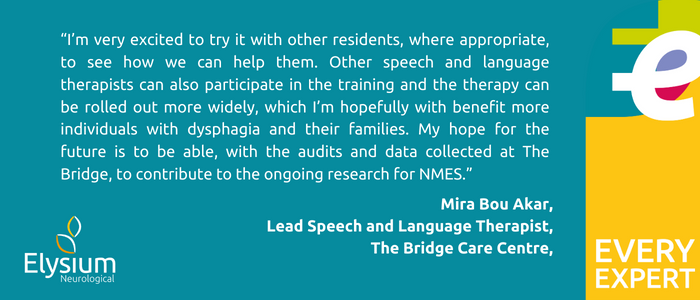 “I’m very excited to try it with other residents, where appropriate, to see how we can help them. Other speech and language therapists can also participate in the training and the therapy can be rolled out more widely, which I’m hopefully with benefit more individuals with dysphagia and their families. My hope for the future is to be able, with the audits and data collected at The Bridge, to contribute to the ongoing research for NMES.”
