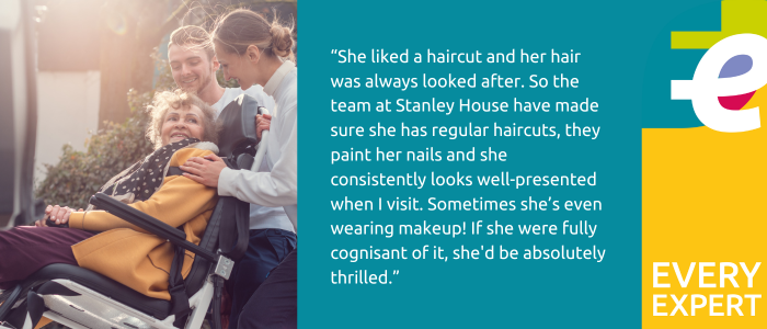 She liked a haircut, and her hair was always looked after. So, the team at Stanley House have made sure she has regular haircuts, they paint her nails, and she consistently looks well-presented when I visit. Sometimes she’s even wearing makeup! If she were fully cognisant of it, she’d be absolutely thrilled.