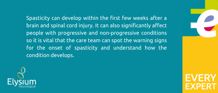 Spasticity can develop within the first few weeks after a brain and spinal cord injury. It can also significantly affect people with progressive and non-progressive conditions so it is vital that the care team can spot the warning signs for the onset of spasticity and understand how the condition develops.