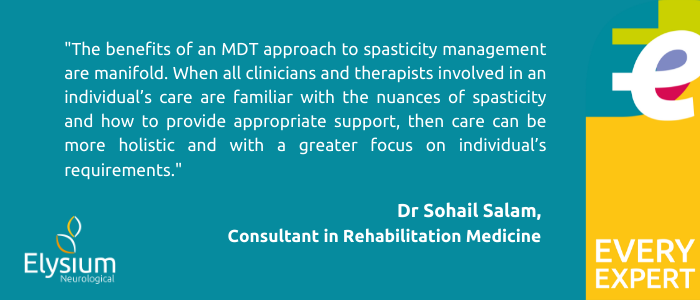 Patients that develop spasticity as a result of a brain injury, spinal cord injury or any other neurological injury, typically often have other significant health issues that require specialist care from a team of clinicians and therapists. Therefore Dr Salam advocates an MDT approach, where expert knowledge and experience can be shared to create a spasticity management plan that responds to the unique but often complex needs of each person.