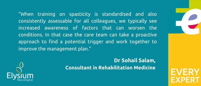 Dr Salam says: “When training on spasticity is standardised and also consistently assessable for all colleagues, we typically see increased awareness of factors that can worsen the conditions. In that case the care team can take a proactive approach to find a potential trigger and work together to improve the management plan. This may mean that the care environment needs to adapted, the patient may benefit from a variety of interventions or therapies. However, this is less possible when there is limited clinical knowledge of spasticity and its effective management.