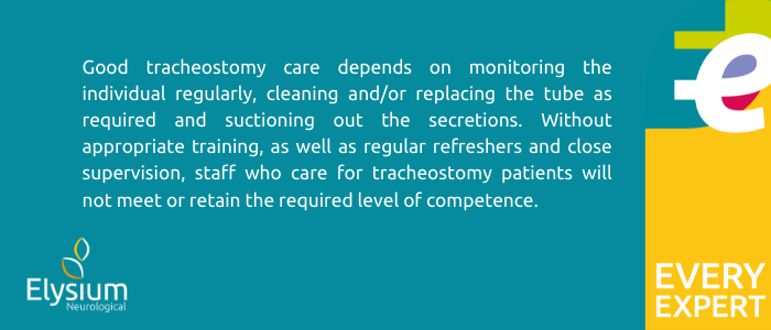 Good tracheostomy care depends on monitoring the individual regularly, cleaning and/or replacing the tube as required and suctioning the secretions out. Without appropriate training, as well as regular refreshers and close supervision, staff who care for tracheostomy patients will not meet or retain the required level of competence in these areas. Consequently, this can lead to poor practice, either through a lack of confidence or complacency, resulting in unnecessary errors or complications for the patient.