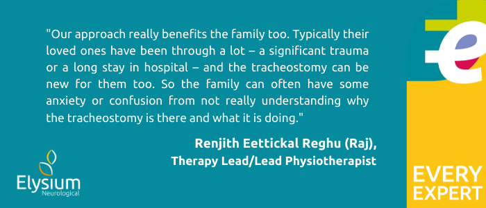 He says: “Our approach really benefits the family too. Typically, their loved ones have been through a lot – a significant trauma or a long stay in hospital – and the tracheostomy can be new for them too. So the family can often have some anxiety or confusion from not really understanding why the tracheostomy is there and what it is doing.