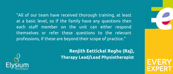 We’re able to explain everything to them in more detail and discuss different elements of tracheostomy care with them. Like why we need to do frequent checks and what the benefit is for their loved one. They really appreciate getting the chance to talk this through, and the good thing is that all of our team have received thorough training, at least at a basic level, so if the family have any questions then each staff member on the unit can either respond themselves or refer these questions to the relevant professions, if these are beyond their scope of practice.”
